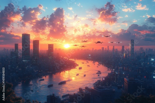 city, sunset, futuristic, skyline, urban, aerial, river, building, modern, technology, transportation, flying, city landscape, sunrise, evening, vibrant, colours, cloud, water, architecture, future, panoramic, horizon, peace, beautiful, amazing, skyscraper, landscape, travel, tour tourism, beauty, design, innovation, advancement, development, progress, intelligent, smart, connectivity, environmental, perspective