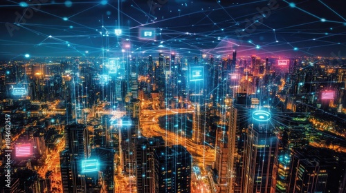 visual, vibrant, urban, transportation, technology, smart, skyline, science fiction, node, night, networked, network, neon, modern, metropolis, light, landscape, interconnected, innovation, illustration, illumination, illuminated, graphic, futuristic, future, environment, energy, dynamic, digital, design, datum, cyber, connectivity, communication, colours, city landscape, city, architecture, abstract