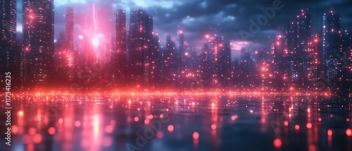 city, futuristic, skyline, night, water, neon, light, glow, urban, city landscape, building, architecture, modern, technology, digital, abstract, fantasy, science fiction, red, pink, blue, dark, vibrant, bright, illuminated, sparkle, energy, power, scene, background, illustration, graphic, design, art, image, photo, picture, view, landscape, panorama