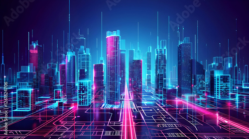 city, skyline, futuristic, neon, light, technology, urban, digital, architecture, night, building, design, landscape, metropolis, illumination, modern, structure, vibrant, blue, pink, nightscape, energy, innovation, high technology, urban life, digital artwork, abstract, cyber, scenery, visual, city landscape, modernity, atmosphere, scene, future, urbanisation, tech, graphic, night view, city lights