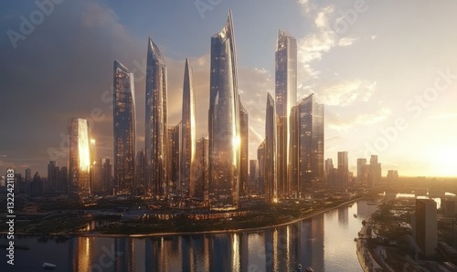 futuristic, city, skyline, tall, reflective, skyscraper, sunset, architecture, building, modern, evening, urban, sun, horizon, technology, light, tower block, tower, cloud, design, glow, metropolis, glasses, innovative, skyscraper, bright, urbanisation, landscape, infrastructure