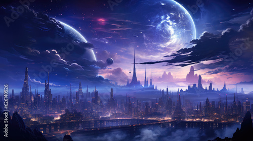 Futuristic cityscape abstract background at night using deep blues, purples, and vibrant neon lights, with elements like skyscrapers, flying vehicles, and holographic advertisements.