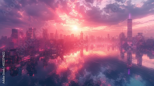 Futuristic cityscape at dusk with neon lights reflecting on sleek skyscrapers