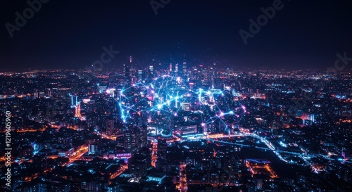 futuristic, city landscape, night, glowing, network, urban, skyline, city, light, technology, connection, digital, datum, networked, architecture, modern, nightscape, illuminated, blue, sky, horizon, metropolis, building, infrastructure, communication, high technology, innovation, abstract, neon, smart, connectivity, visualisation, bright, night time, cyber, energy, grid, vibrant, structure, urbanisation, interconnected
