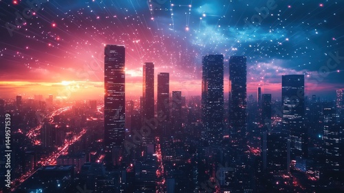 city, city landscape, skyline, futuristic, sunset, urban, skyscraper, building, architecture, digital artwork, neon light, technology, innovation, modern, metropolis, twilight, sky, red, pink, blue, glowing, light, network, datum, communication, design, abstract, illustration, artwork, contemporary, energy, connectivity, travel, downtown, infrastructure, illuminated, tower block, panorama, aerial view, vibrant, cloudscape, evening, dusk, business, economy, finance, construction, development