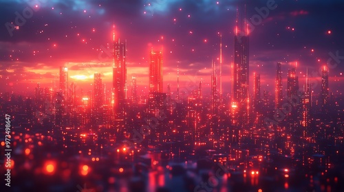 Futuristic Cityscape at Sunset with Red Lighting and Neon Glow