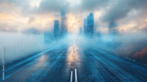 city, city landscape, road, highway, fog, misty, cloud, sky, sunrise, sunset, futuristic, technology, digital, network, line, grid, abstract, modern, architecture, building, tower, skyscraper, urban, landscape, perspective, journey, future, progress, advancement, innovation, development, transportation, travel, path, way, destination, horizon, light, glow, aethereal, mystical, dreamlike, scene
