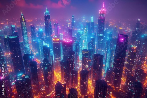 futuristic cityscape illuminated by vibrant neon lights at night showcasing towering skyscrapers and a bustling metropolis filled with energy and a sense of wonder
