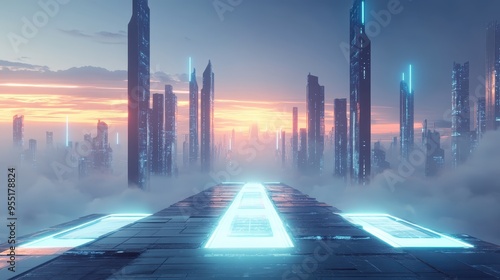 Futuristic cityscape with high-rise buildings, glowing lights, and a misty atmosphere at sunset, exuding a sci-fi ambiance.