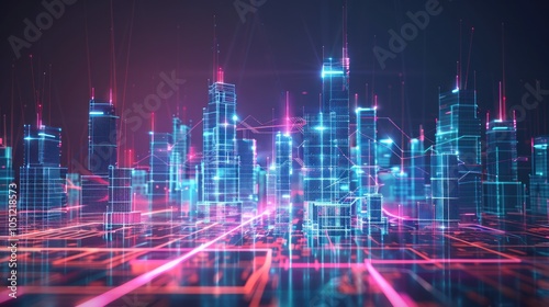 city landscape, futuristic, city, neon, light, digital, technology, network, modern, architecture, urban, glow, sky, night, skyline, abstract, graphic, building, design, concept, illustration, graphic, art, future, bright, blue, pink, purple, red, wireframe, three-dimensional, rendering, visual, style, line, grid