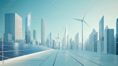 Futuristic cityscape with solar panels and wind turbines.