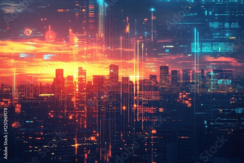 city landscape, futuristic, digital, overlay, sunset, skyline, building, architecture, urban, technology, datum, information, interface, network, connection, communication, innovation, design, abstract, modern, vibrant, glow, light, structure, perspective, rendering, art, background, pattern, system, virtual, cyberspace, matrix, code, programming, coding, stream, visualisation, ai, cloud, computing, server, infrastructure, electricity, engineering, energy, power