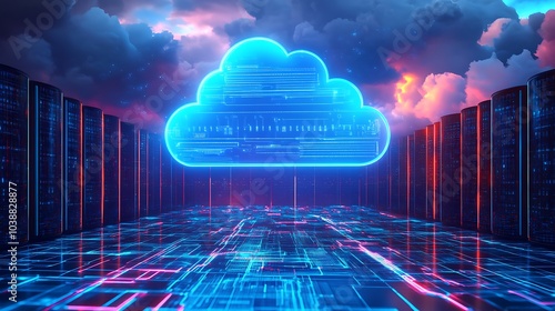 Futuristic Cloud Computing Network Servers. Digital illustration of cloud computing infrastructure with vibrant blue neon lights and futuristic data servers.