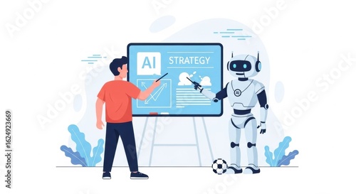 artificial, intelligence, strategy, collaboration, presentation, robot, planning, analysis, whiteboard, discussion, technology, meeting, teamwork, brainstorming, innovation, automation, futuristic, digital, business, concept, ai, learning, coaching, partnership, android, design, lecture, training, seminar, soccer, growth, machine, chart, education, solution, conference, development, communication