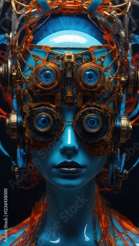 Futuristic Cybernetic Headpiece with Intricate Orange and Blue Design