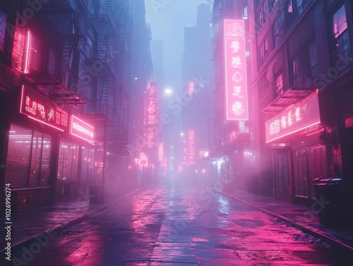 futuristic cyberpunk city streets illuminated by neon lights and enveloped in moody fog, evoking a sense of dystopian beauty and the haunting allure of an empty future
