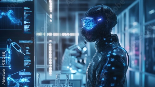 Futuristic cyborg in a laboratory setting, with advanced technology and a glowing blue interface.