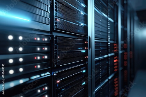 Futuristic data center with glowing blue and red LED servers, ideal for illustrating AI computing, cybersecurity, cloud infrastructure, and modern IT network technology concepts