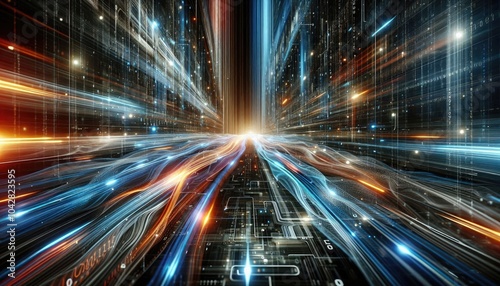 Futuristic Data Highway: Rapid Light Trails Representing Machine Learning, AI Processing, and Big Data Transmission in a Digital Matrix Environment with Floating Binary Code