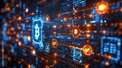 Futuristic digital blockchain network with Bitcoin symbols, highlighting cryptocurrency transactions and decentralized systems in vibrant colors.