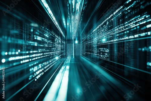 Futuristic digital corridor with glowing data streams, representing technology and innovation