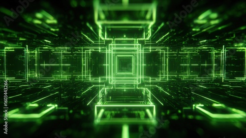 Futuristic Digital Grid Technology Scene with Glowing Green Lines and Geometric Patterns in Cyber Space Environment
