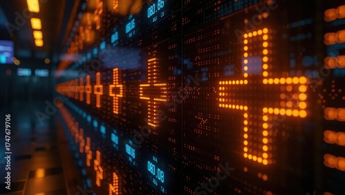 technology, futuristic, digital, health, medicals, health care, plus, symbol, glowing, neon, orange, light, background, abstract, corridor, hallway, perspective, datum, information, server, network, cyber, virtual, screen, display, led, positive, addition, growth, innovation, future, modern, science, computer, system, electronic, tech, matrix, code, binary, dark, illuminated, concept, design, graphic, wall, interior, tunnel, finance