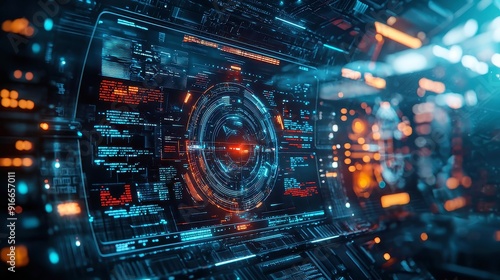 Futuristic Digital Interface, an advanced digital display featuring intricate data visualizations and holographic elements set against a vibrant, dynamic backdrop