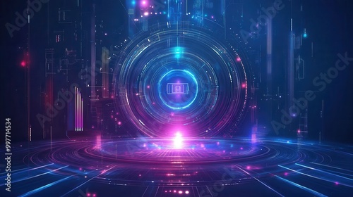 futuristic, digital, interface, glowing, circle, line, abstract, technology, neon, blue, pink, purple, dark, background, light, design, pattern, graphic, geometric, style, modern, vibrant, dynamic, concept, illustration, space, virtual, reality, network, connection, datum, energy, power, innovation, creative, art, aesthetic