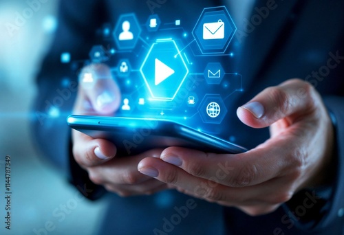 Futuristic Digital Interface with Holographic Social Media Icons and Smartphone Interaction