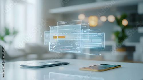 Futuristic Digital Interface with Touchscreen Devices and Data Overlay