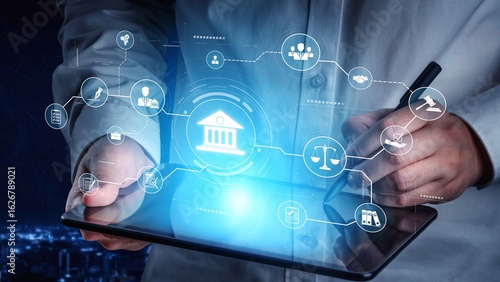 Futuristic digital law interface displaying justice scale, highlighting digital law, AI compliance, digital law systems, and digital law regulations for secure governance. Muxer