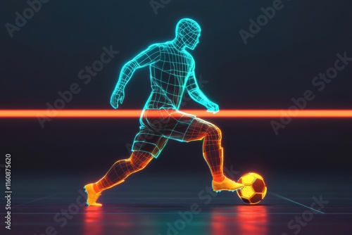 digital, soccer, player, motion, sport, technology, neon, graphic, action, design, energy, ball, athletic, gaming, illustration, blue, orange, holographic, artistic, movement, competition, training, goal, dynamic, modern, creativity, three-dimensional, optical, gameplay, fitness, abstract, contemporary, scoring, field, speed, excitement, performance, animation, technique, style, youth, skill, teamwork, highlight, agency, interactivity, imagination