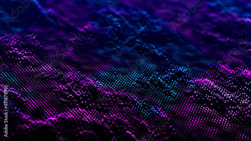 Futuristic dots pattern on dark background. Colored music wave. Big data. Technology or Science Banner. 3D rendering