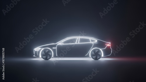 Futuristic Electric Car Silhouette Neon Outline in Dark Background