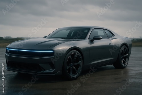Futuristic electric muscle car parked on wet asphalt under cloudy sky