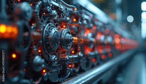 Futuristic factory machine close-up. Modern production line gear system. Manufacturing tech, industrial plant. Concept of industry 4. 0. Assembly automation process. Metalworking, engineering.