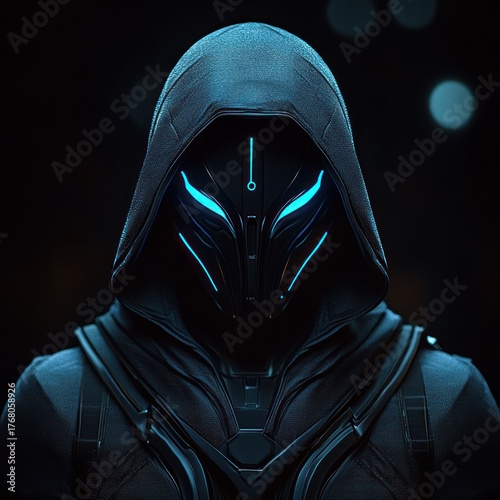 Futuristic figure in dark hooded cloak with glowing blue accents on sleek mask set against a black background evoking mystery and advanced technology