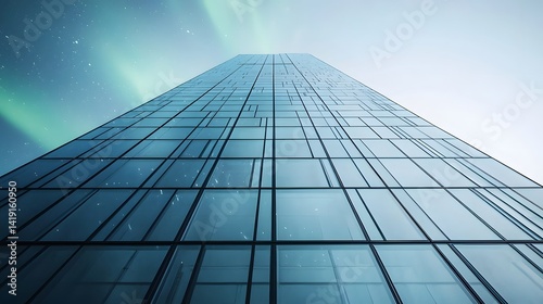 Futuristic glass skyscraper reflecting the swirling green and blue auroras in the dramatic night sky creating a mesmerizing and captivating scene of modern architecture and natural wonder