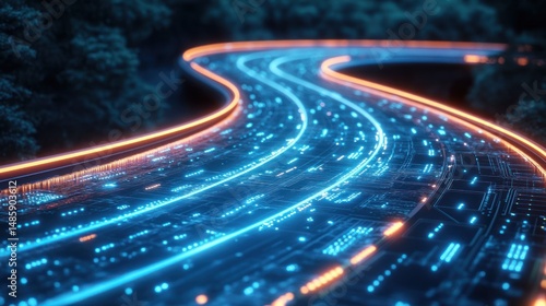 Futuristic glowing curved highway with blue and orange illuminated digital patterns through a dark wooded area, evoking a sense of advanced technology and motion