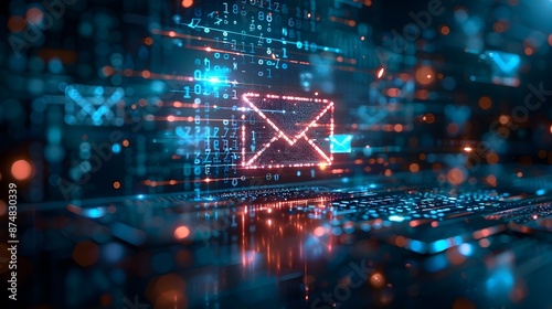 futuristic, electronic mail, icon, holographic, element, glowing, floating, digital, space, concept, technology, science fiction, three-dimensional, render, abstract, geometric, wireframe, datum, network, communication, connectivity, messaging, envelope, symbol, interface, neon, illuminated, tech, virtual, message