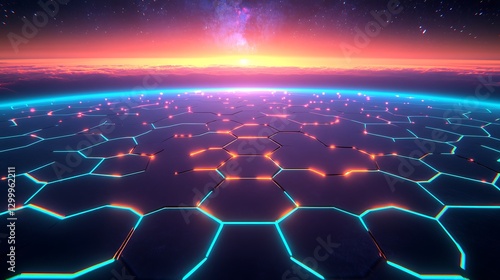 Futuristic Hexagon Landscape at Sunset with Nebula