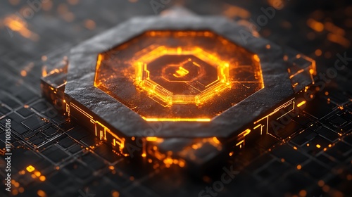technology, futuristic, hexagonal, core, glowing, orange, dark, abstract, digital, science, fiction, circuit, board, system, energy, power, light, line, design, grid, pattern, texture, background, illustration, rendering, three-dimensional, model, modern, innovative, complex, intricate, detail, polished, metallic, stone, shadow, vibrant, illuminated, surface, spark, particle, intense, heat, bright, contrast, sharp, depth, sharpened