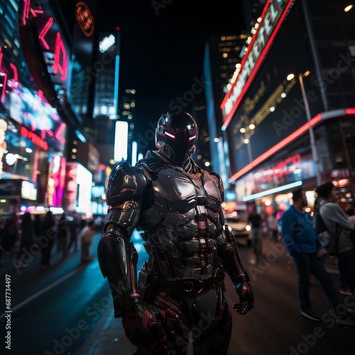 futuristic humans and robots in a city at night with neon light surroundings, AI, artificial intelligence concept, future world concept