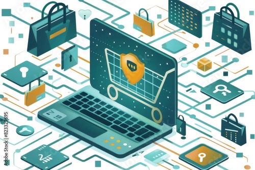 Futuristic Illustration of E commerce Security with Digital Locks, Technology Icons, and Shopping Elements