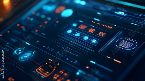 Futuristic Interface 3D Illustration with Blue and Orange Glowing Elements
