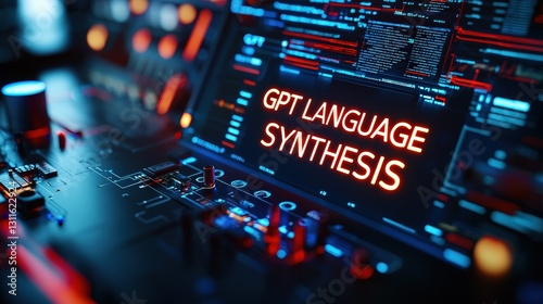 Futuristic Interface Displaying GPT Language Synthesis with Neon Lights and Circuit Patterns