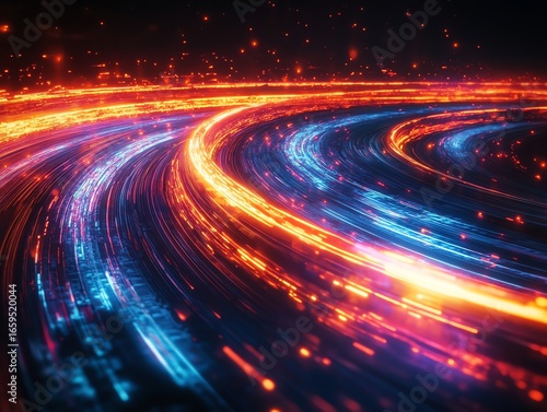 Futuristic Light Trails Abstract Background with Vibrant Orange and Blue Neon Colors