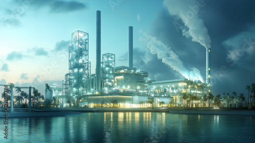 futuristic, power, modern, sustainable, energy, industrial, palm, tree, water, cloudy, sky, environmentally friendly, innovation, clean, technology, renewable, urban, infrastructure, coastal, serene, advanced, engineering, green, waterfront, contemporary, efficient, design, low, emission, facility, production
