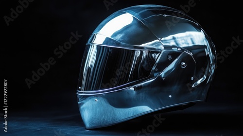 Futuristic metallic helmet on dark background with reflective surface and space for text or branding. Ideal for technology or sports themes.